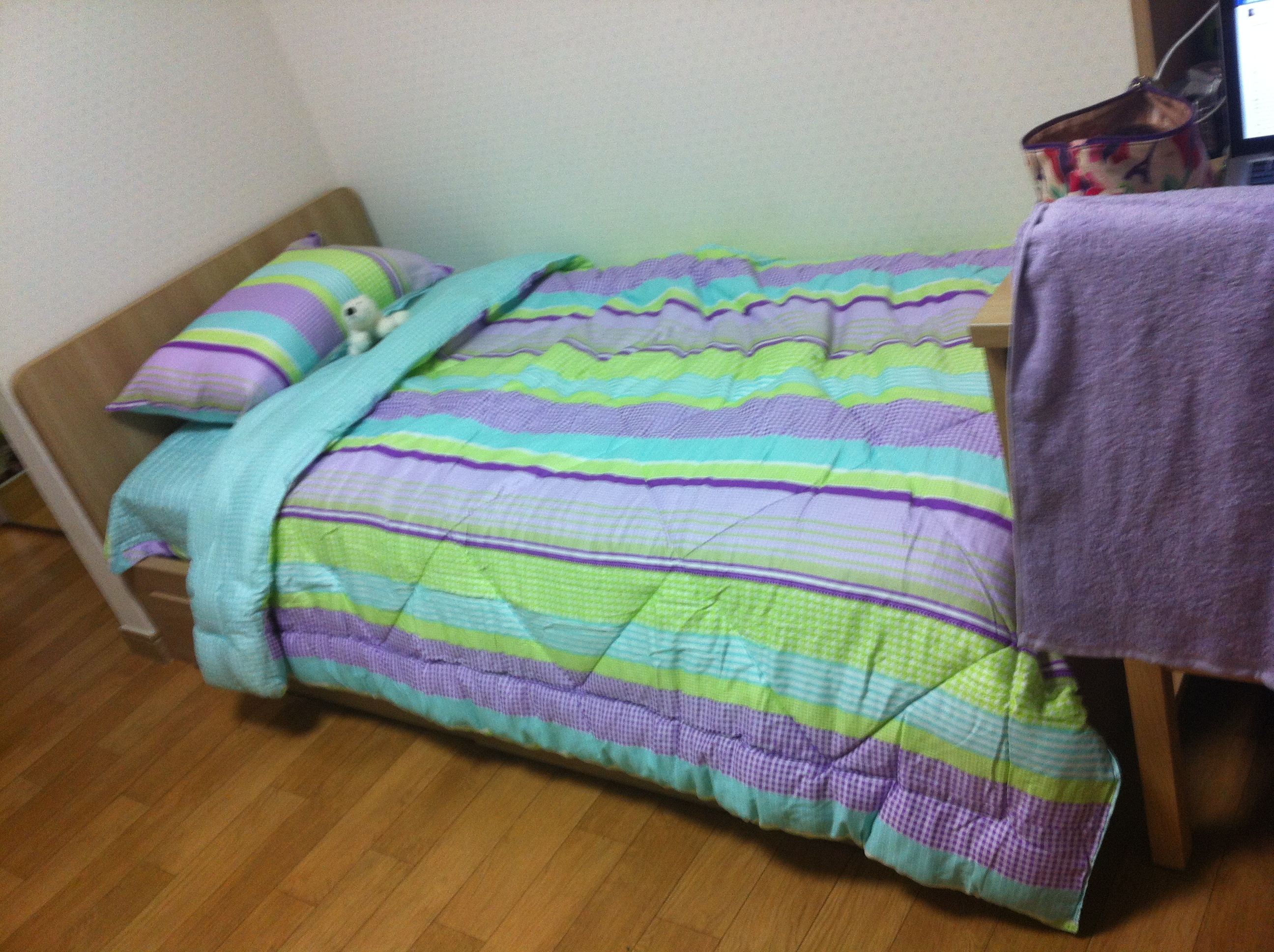 Looks great Gabrielle! Wow, you are going to have to stay organized in the space that you two will be sharing. Love the bedding, a very happy combination of color and your fury friend looks comfy. Remember not to throw your noodle water into the water purifier and what a bonus you can have pizza delivered to your room 😉