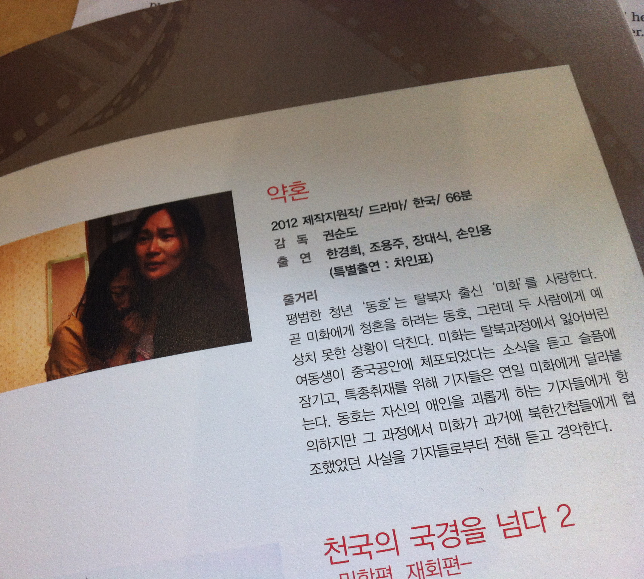 The first film I watched was called “Engaged” (약혼). It started off with a North Korean woman and her younger sister attempting to cross the Tumen River into China. The main character makes it, but her younger sister is captured by the NK guards. Like so many North Korean women who defect into China in search of a better life, the woman finds her only option for making an income is through the sex trade. She joins a brothel and is subjected to horrible treatment by the Johns. Each day is an intense struggle as she battles nightmares about her sister (whose whereabouts are unknown to her) and lives in constant fear of being discovered by any North Korean spies who would deport her back to the DPRK.
