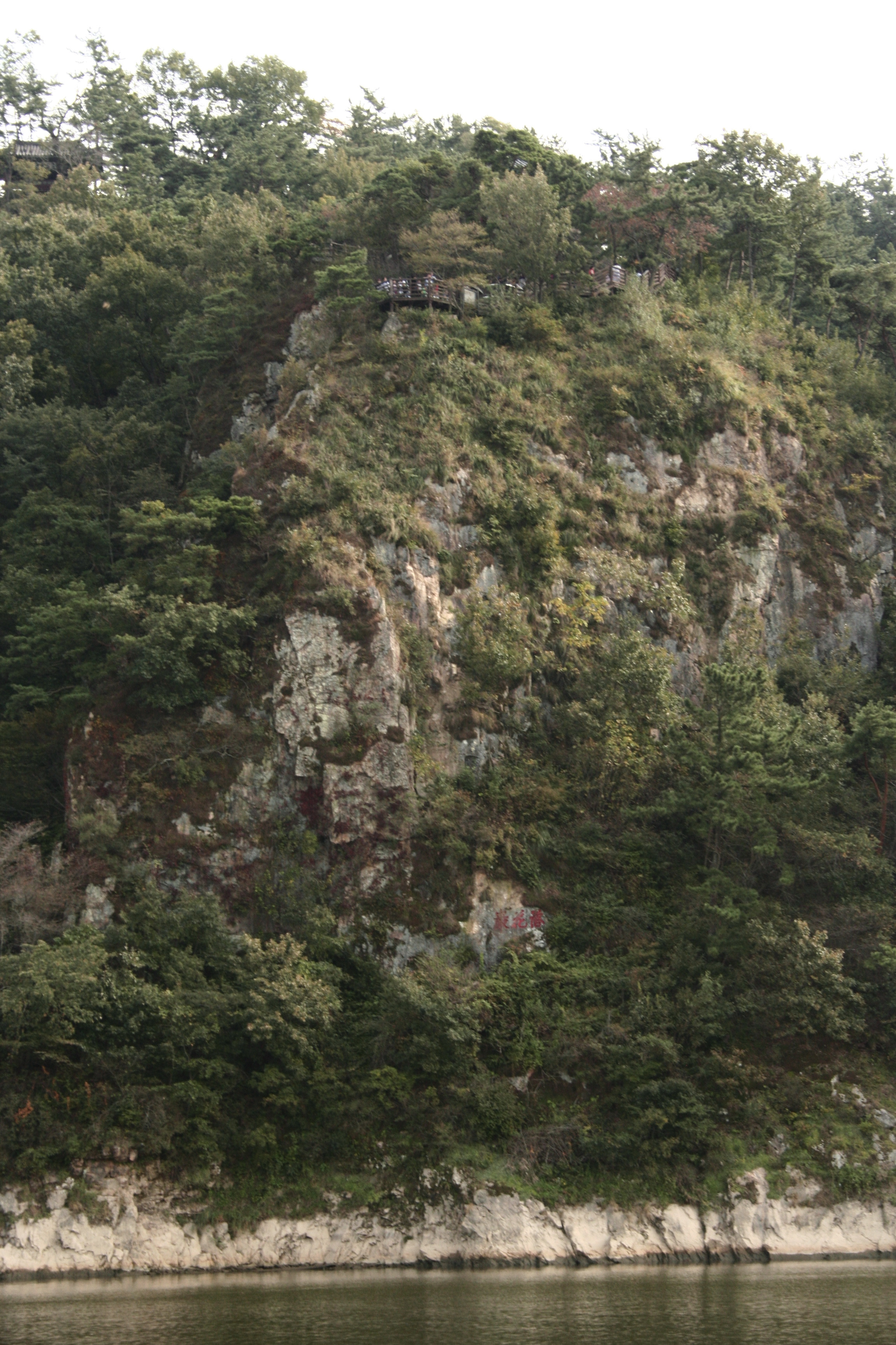 Pavilion on the top of Nakwha-am, a significant place in Korean history. This mountain, which is called “Rock of Falling Flowers”, was the scene of a tragic historical event. 3,000 women who’d been captured by invaders jumped off the cliff and committed suicide, after having been captured, taken from their homeland, and made into comfort women for their captors. The cliff is now called Nakwha-am, or “Rock of Falling Flowers”.