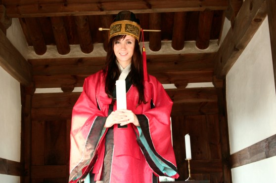 Wearing traditional Confucian ceremonial dress.
