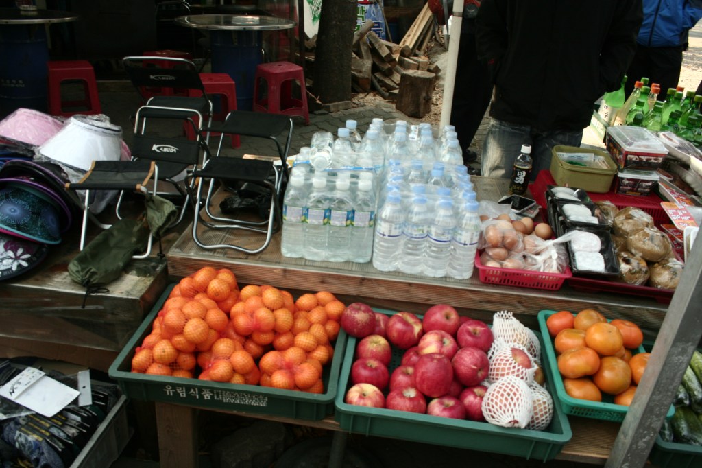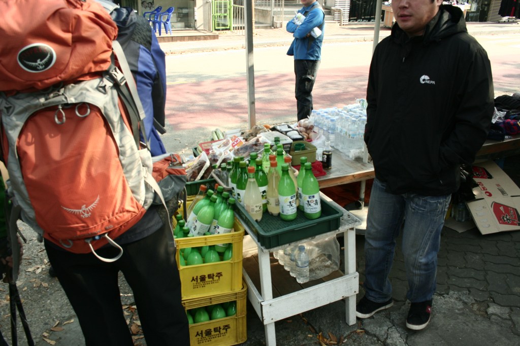 The green bottle of rice wine is called makkoli, a kind of sweet/sour drink with a milky consistency. Most people were having a picnic up here.
