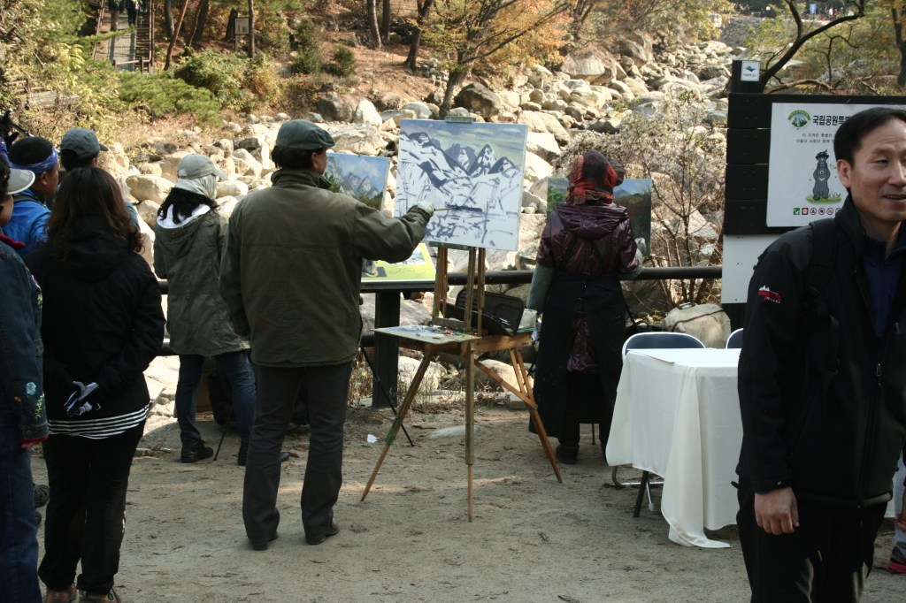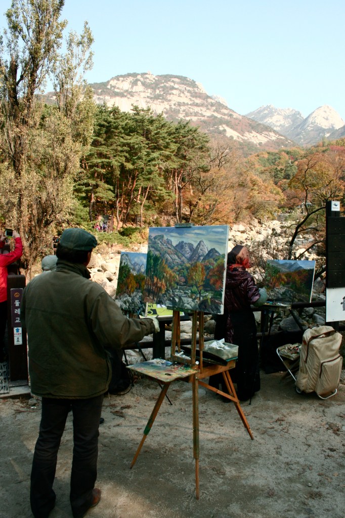 The mountain was SO busy! It was a crisp, sunny Saturday morning, so lots of people were heading up the mountain with their friends and family. Bags filled with beer, makkoli, and snacks (like gimbap – Korean sushi rolls, fruit, granola bars, etc) these hikers were ready to make the short hike up to the peak.