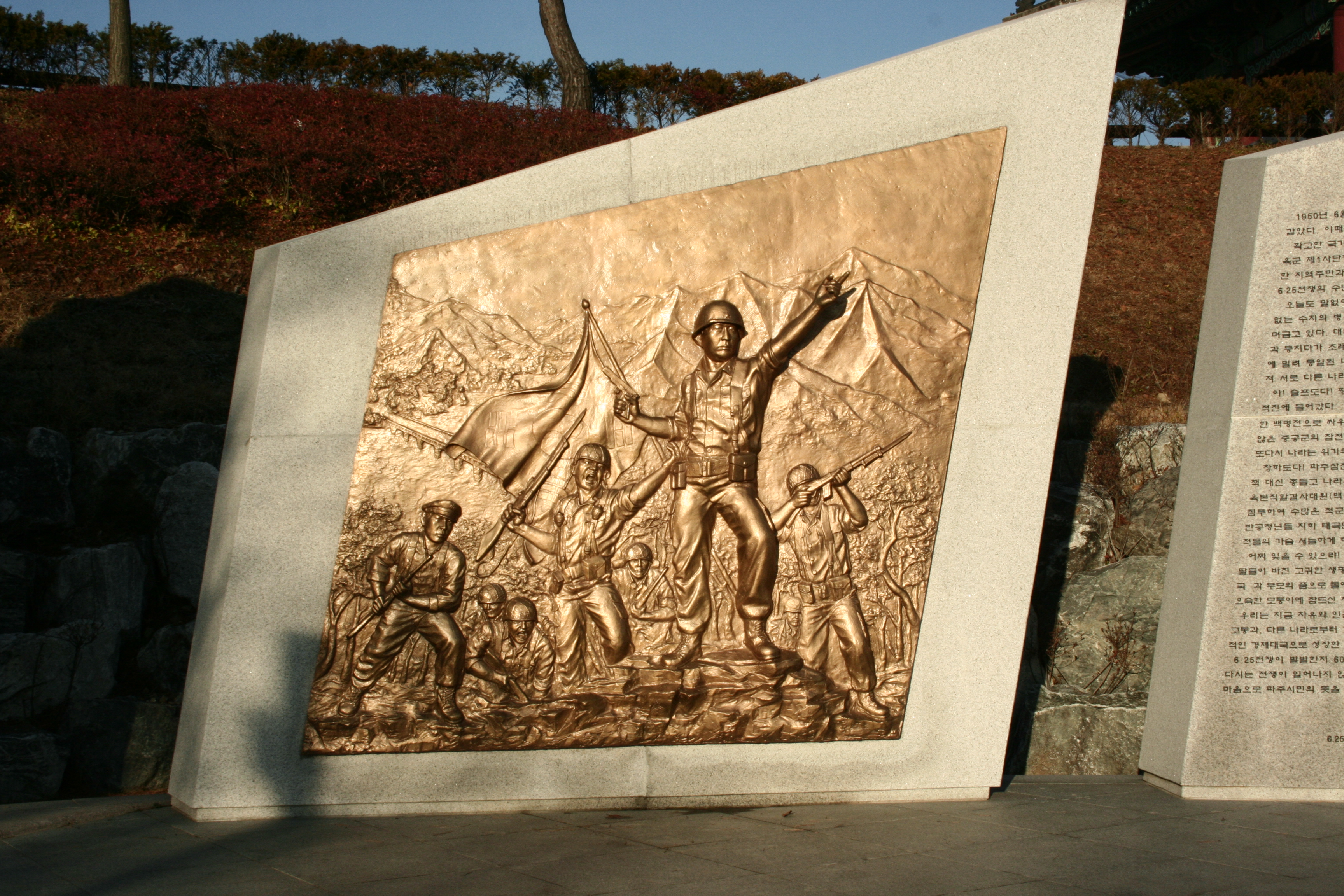 A bronze relief depicting the Korean War near the Freedom Bridge.