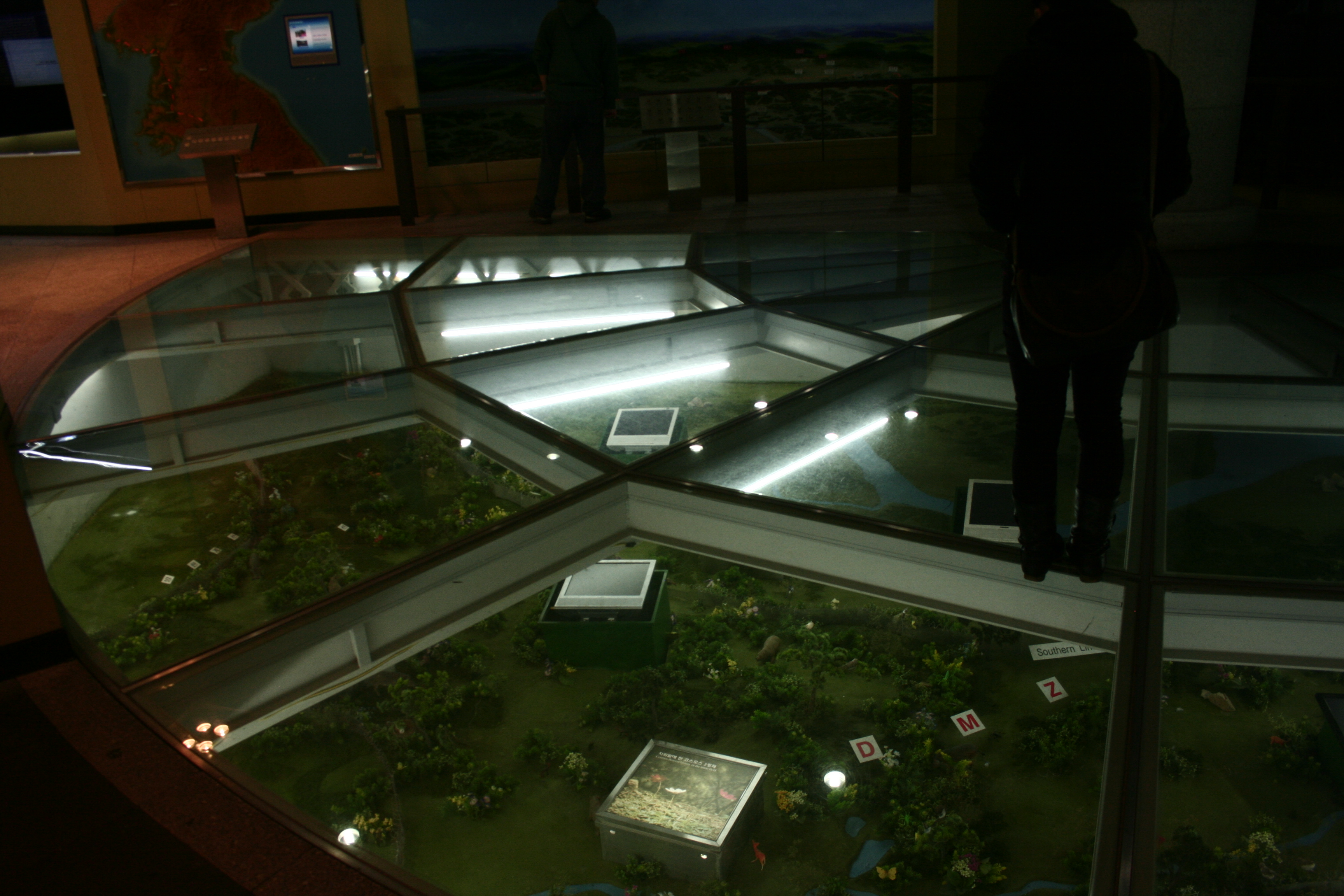 Staring out into North Korea! The faint white triangle in the middle of the landscape is a North Korean propaganda village. The area next to the DMZ has very few (if any) NK civilians living there, so the village just serves as storage, training, and the occasionally housing facility for the NK military stationed there. You may be able to see a very small rectangle in front the of the triangle. Through the binoculars I was using, I could actually see what was on it. It was a propaganda poster, featuring a woman in hanbok (traditional Korean dress) holding a child. The writing in Korean was too hard to read, and I can barely understand the language anyways ^^