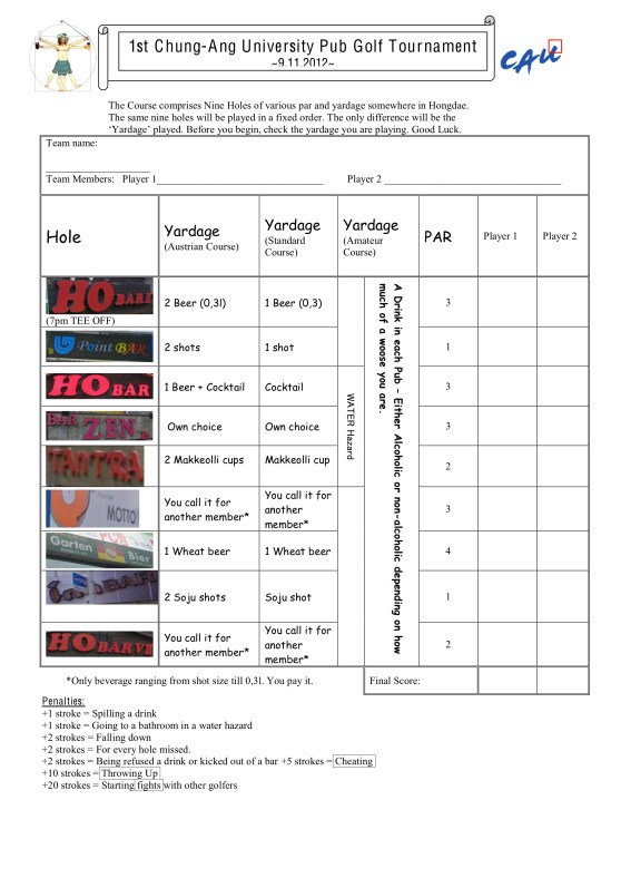 DISCLAIMER: This challenge was in no way, shape or form officially associated with Chung-Ang University. It was just for fun. Logos used were not done so officially. Now, continue on with the Pub Golf guide!
