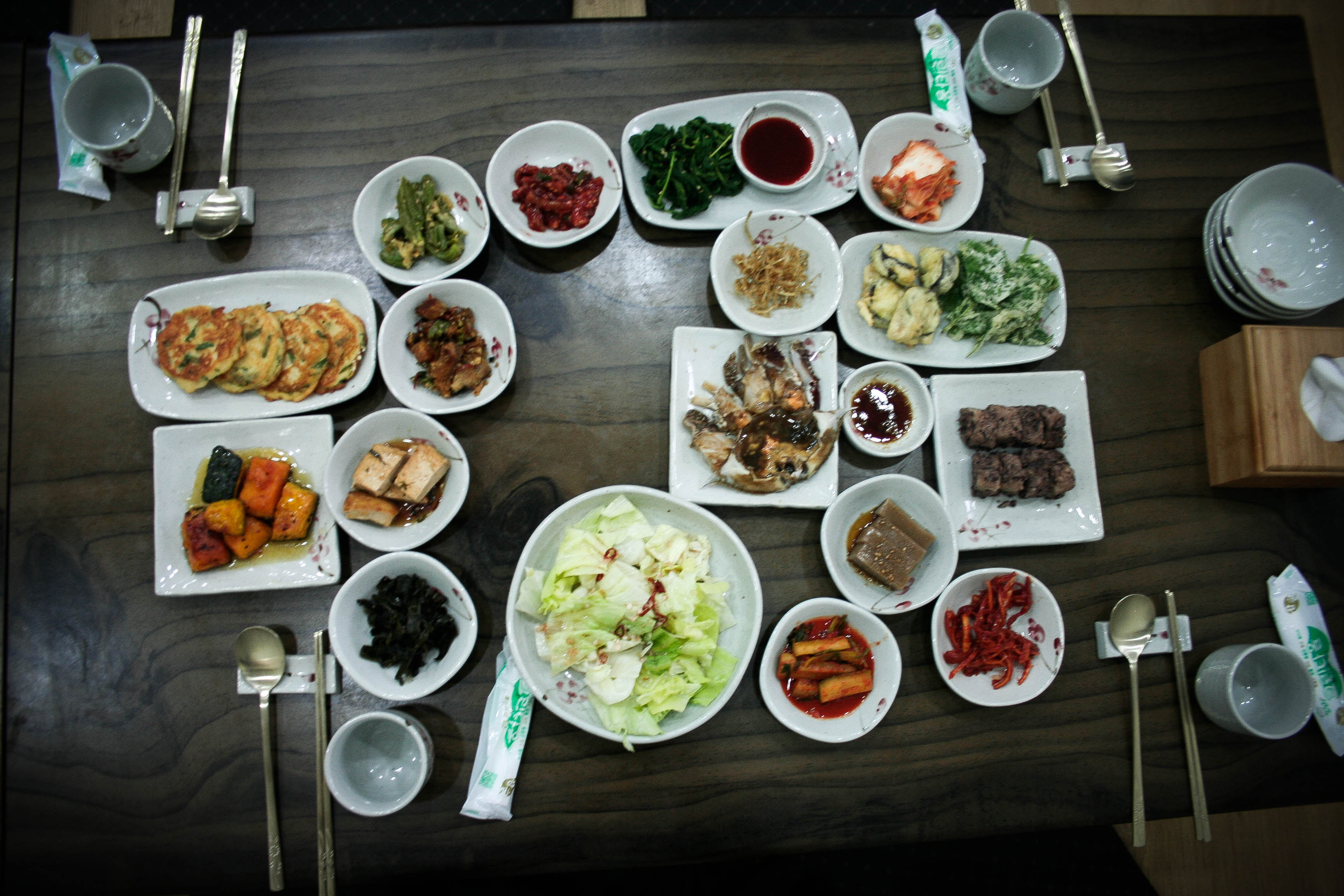 Typical Korean-style table setting: tons of small side-dishes surround the main dish, which hadn’t arrived at this point.