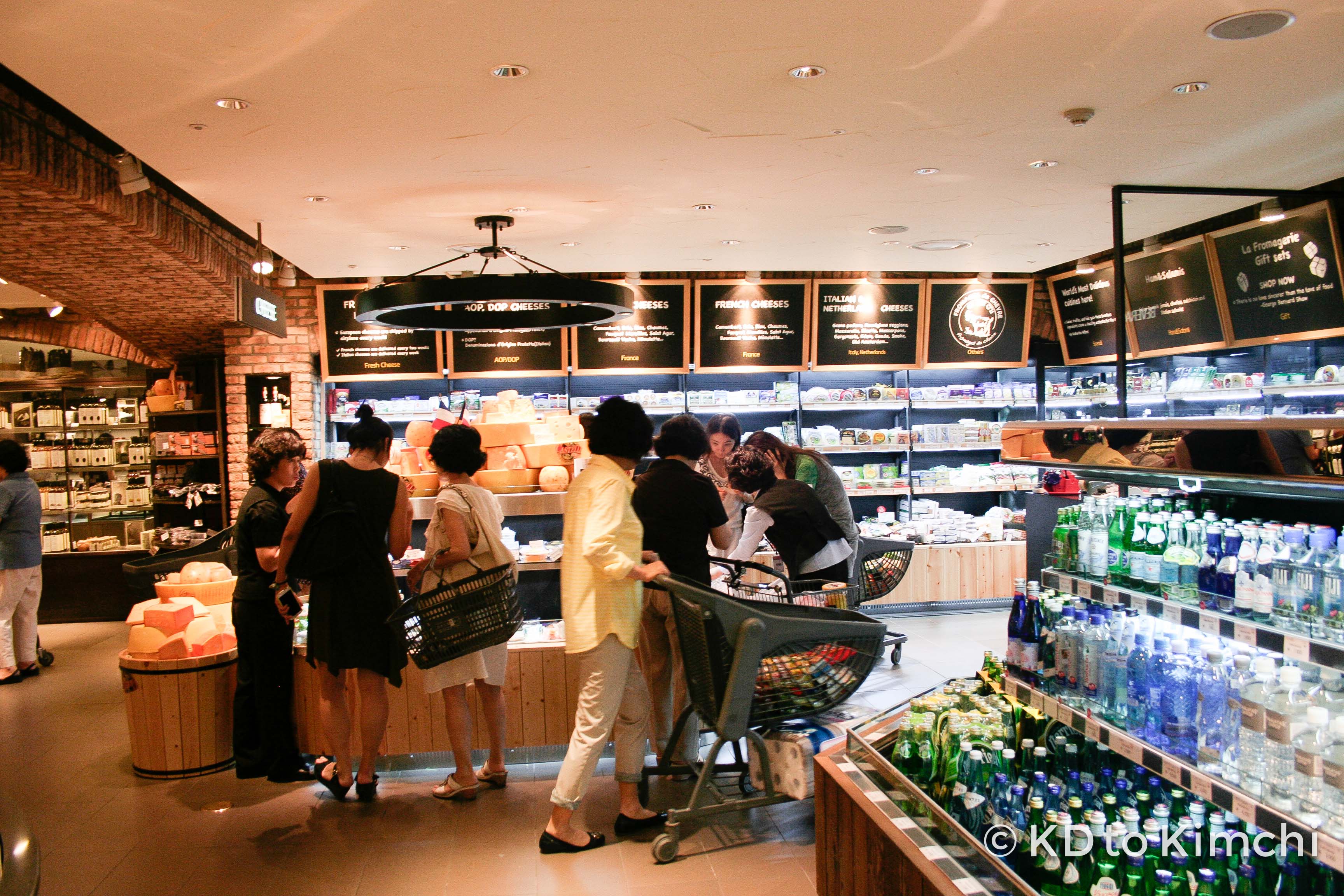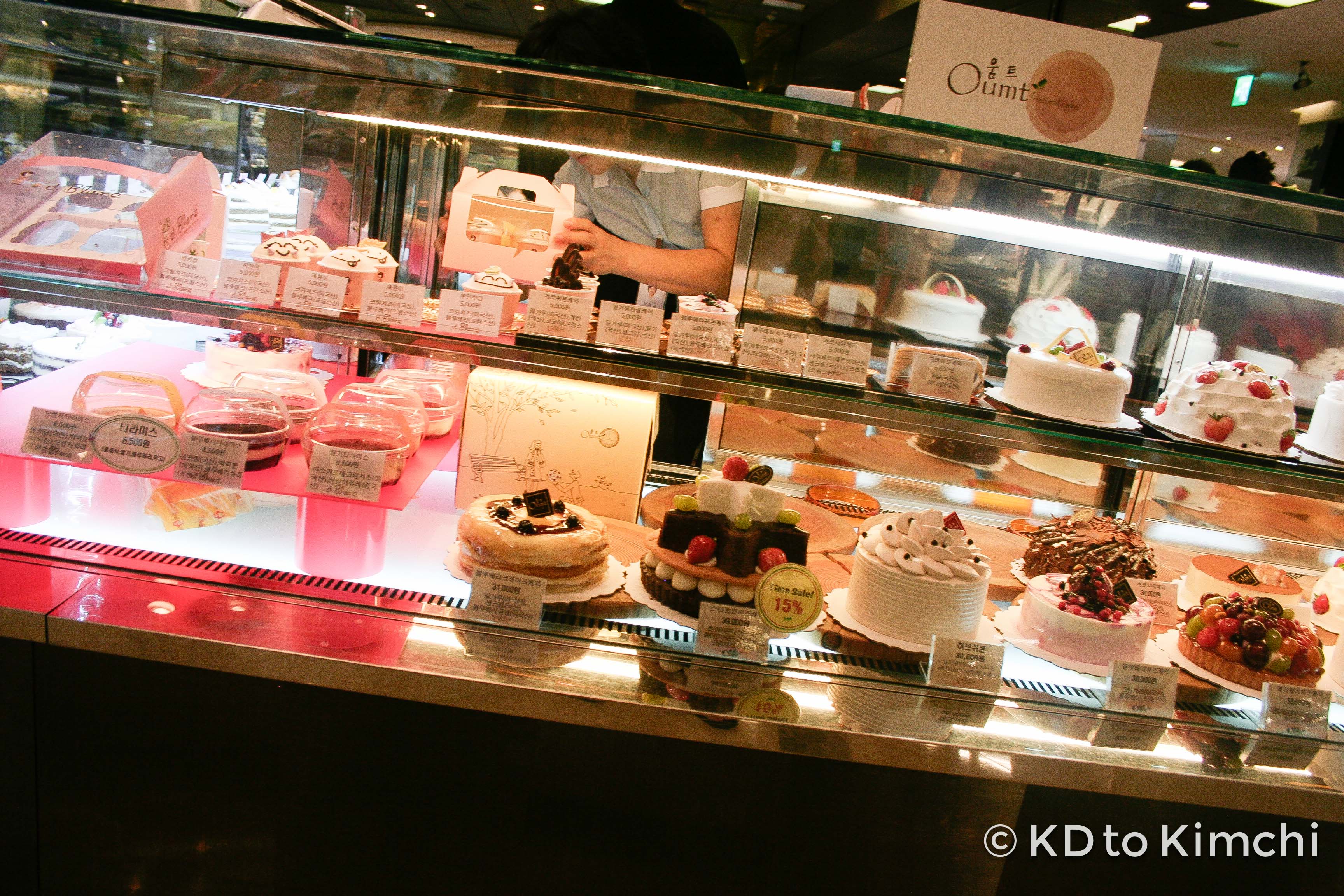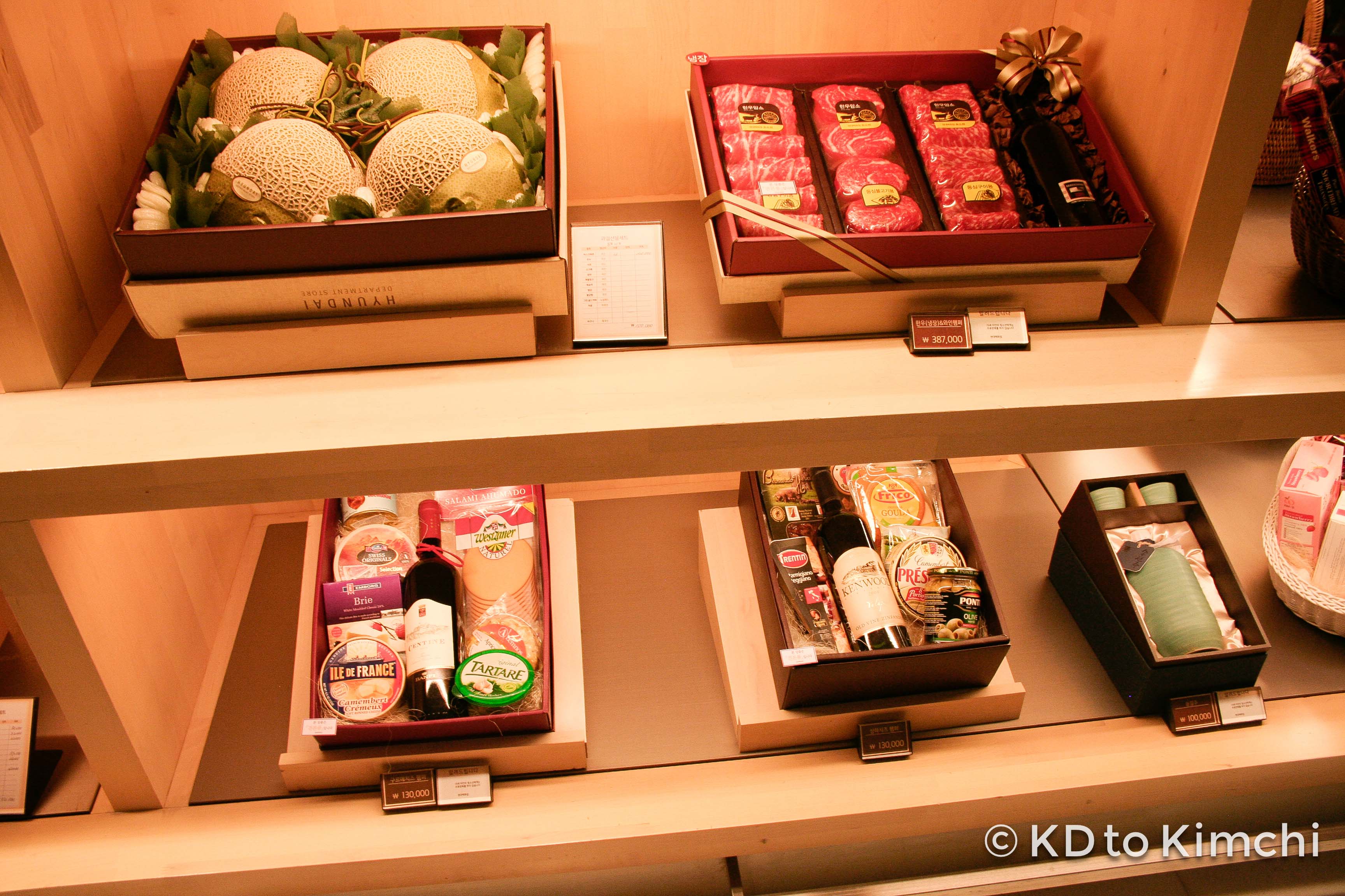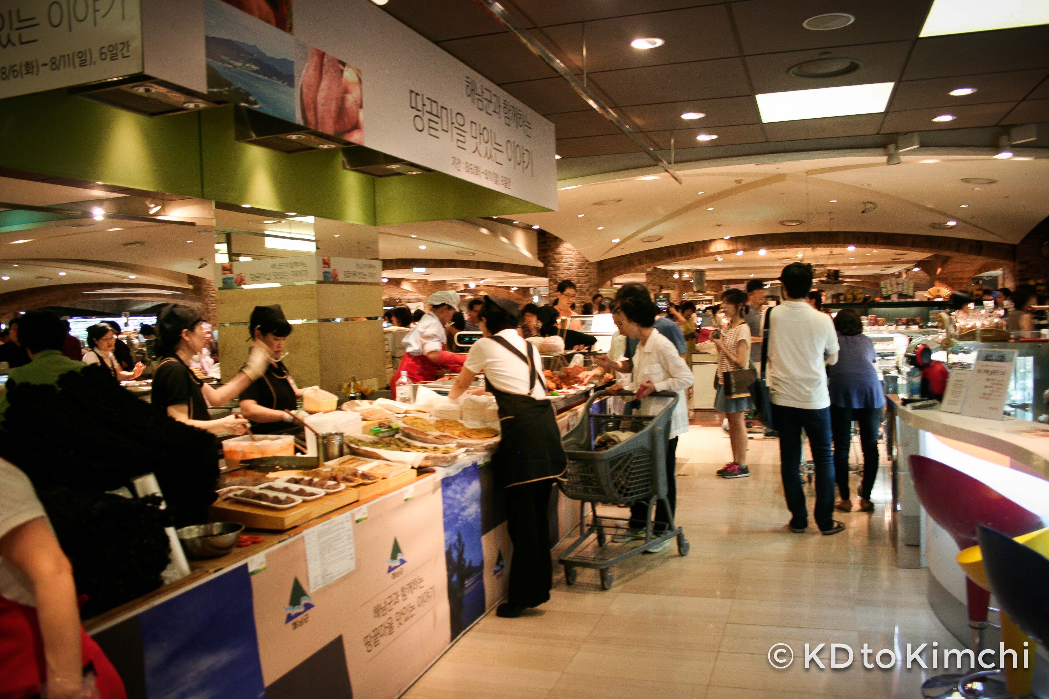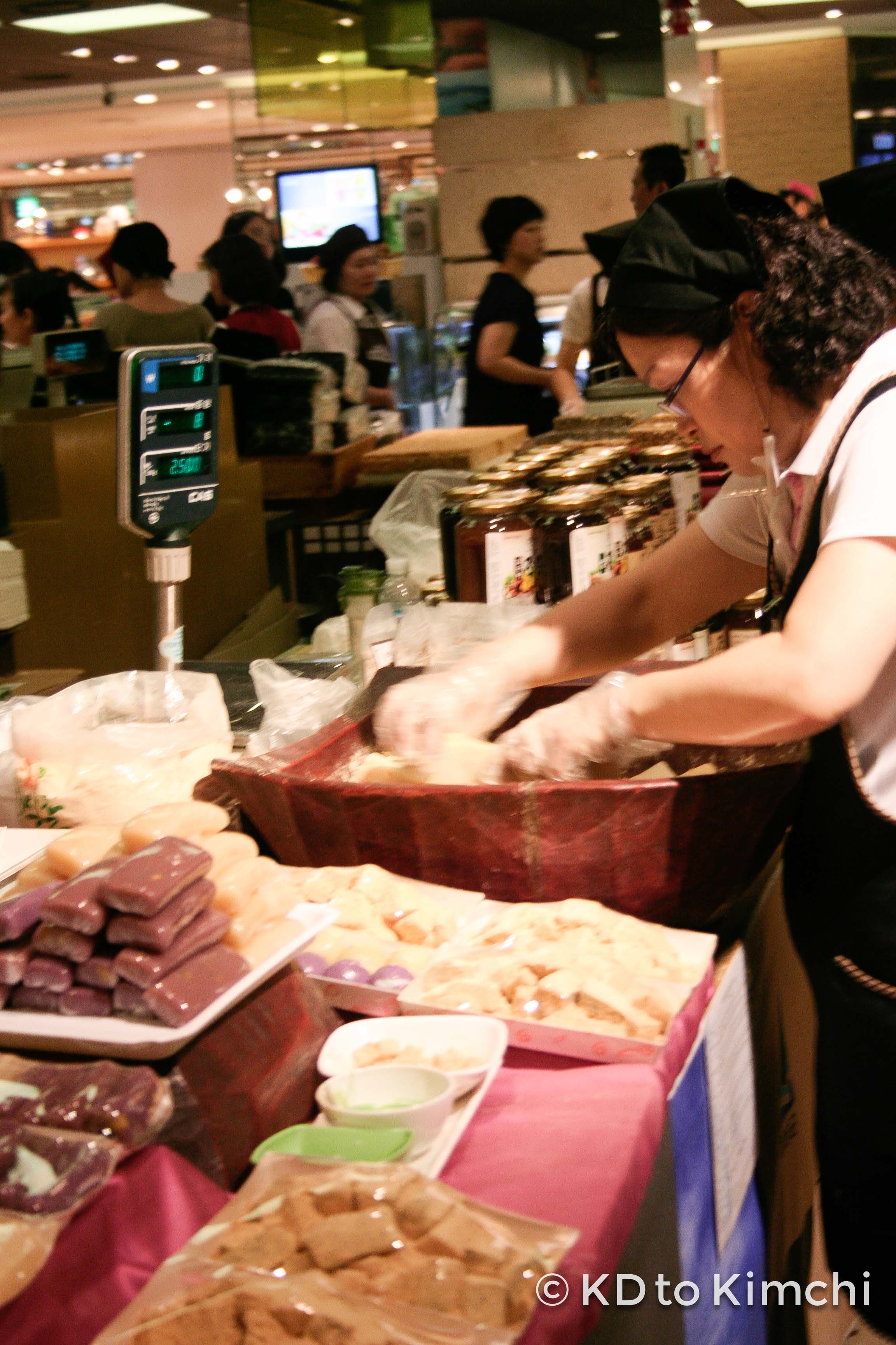 Department store shopping is a popular activity in Korea. Every store has its own food floor, which I’ve noticed is essentially divided up into three sections: the “market” area, made up of different stalls selling fresh food and drinks; the food court, made up of a variety of restaurants (sushi, Japanese curry, noodle soup, Western, etc) where customers order and pay at a centralized cashier booth, then sit down and wait for their number to be called; and the grocery store.