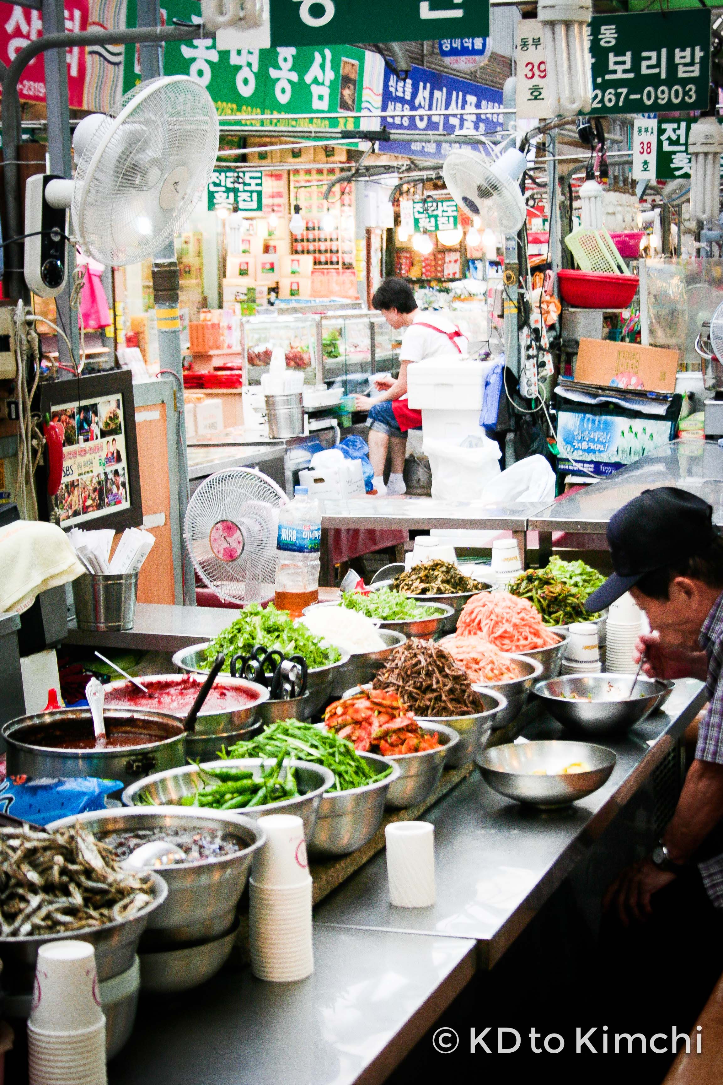 The top eats at Gwangjang Market are bindatteok (빈대떡) – fried mung bean pancakes, and bibimbap (비빔밥) – mixed veggies served on top of rice with spicy chili paste.